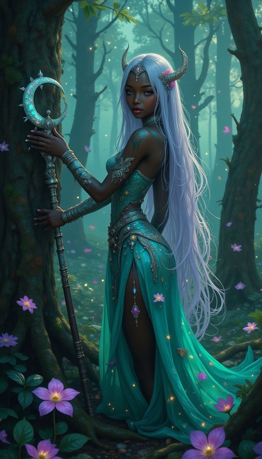 A mystical female figure stands in an enchanted forest. She has long white hair adorned with flowers, and small horns on her head. Her regal attire is a flowing, intricately detailed teal gown with shimmering accents. She holds a staff topped with a crescent shape, and is surrounded by purple flowers and ethereal lights.
