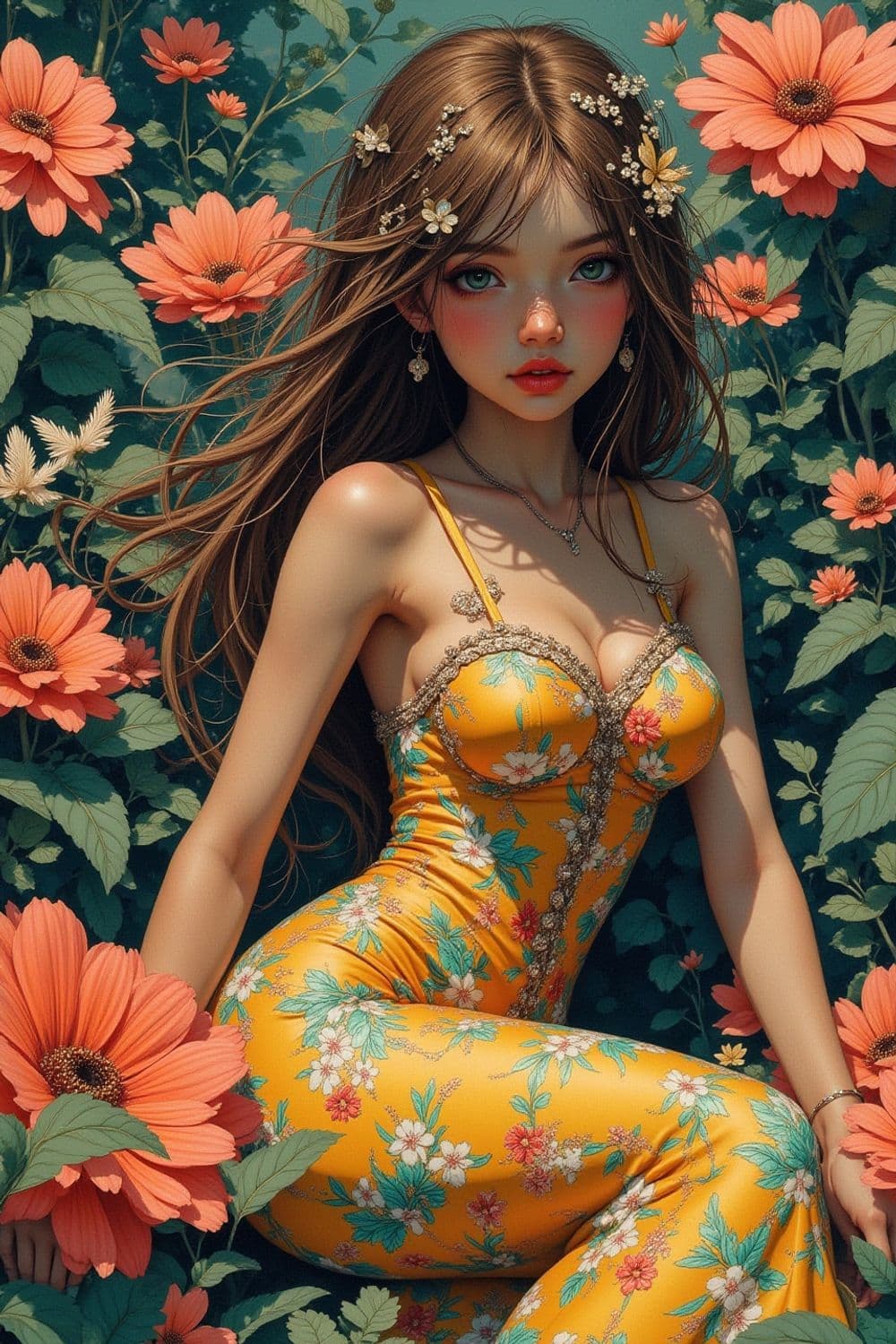 A digital art depiction of a young woman in a vibrant floral environment. She is wearing a fitted yellow dress adorned with intricate floral patterns. Her long brown hair is decorated with small flowers, and her expression is serene. Surrounding her are large, vivid orange flowers and lush green foliage, contributing to the enchanting, garden-like atmosphere.