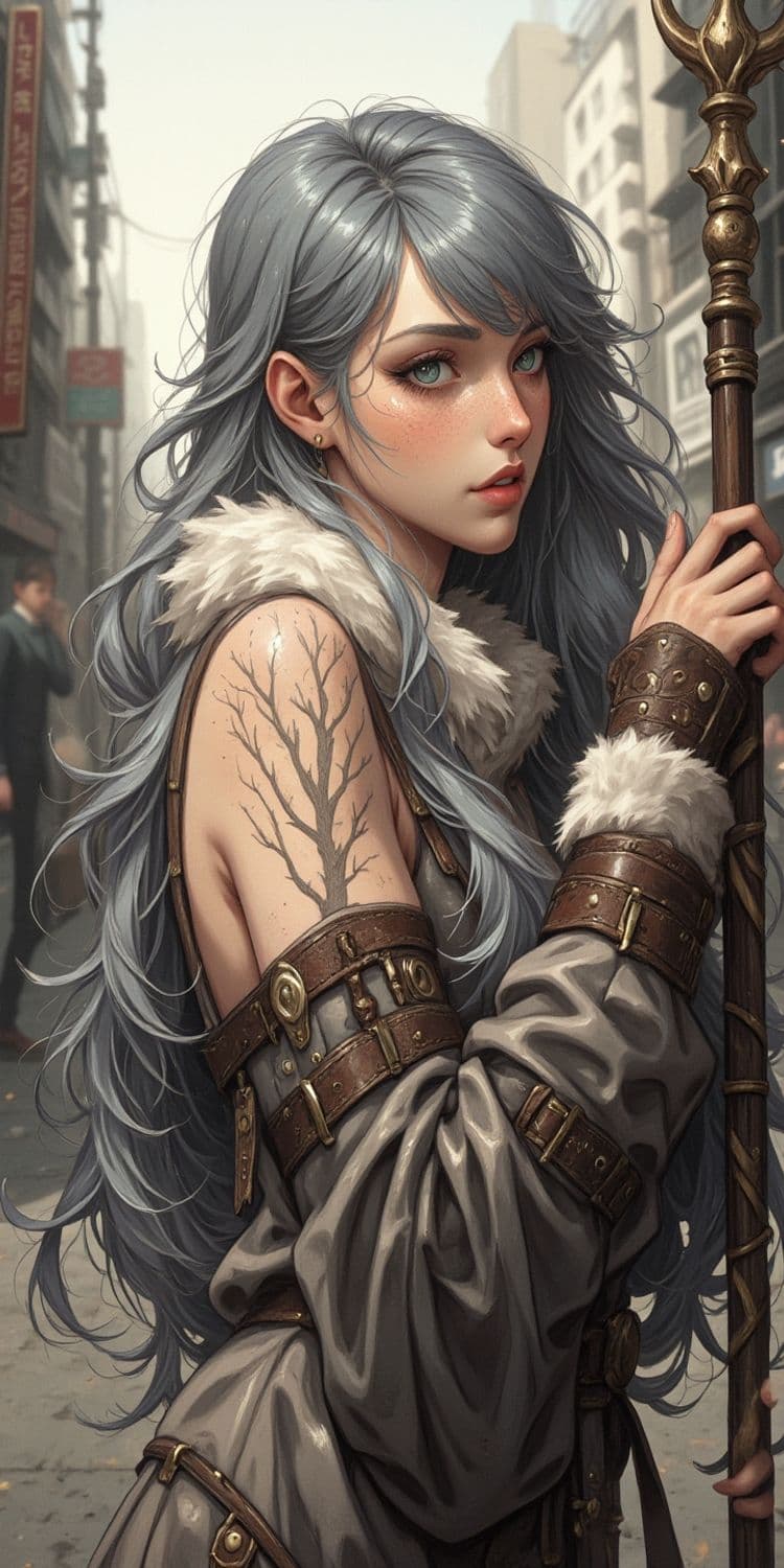 The image depicts a young woman with long, flowing silver hair standing in an urban setting. She wears a fur-lined cloak and ornate leather straps with intricate patterns and holds a staff with detailed carvings. A striking tree tattoo covers her upper arm, adding an element of nature to her urban attire. The background includes blurred buildings and pedestrians, giving the setting a bustling city feel.