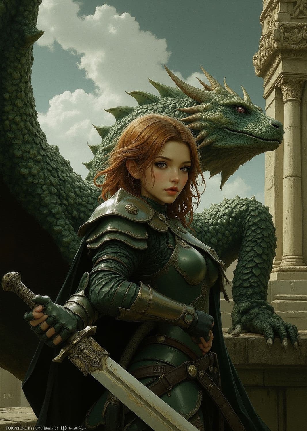 A fierce female warrior with red hair stands confidently in ornate green armor, clutching a sword. Beside her is a majestic green dragon, its scales reflecting light as it rests against an ancient stone structure. The sky is a muted blue with scattered clouds, enhancing the mythical ambiance.