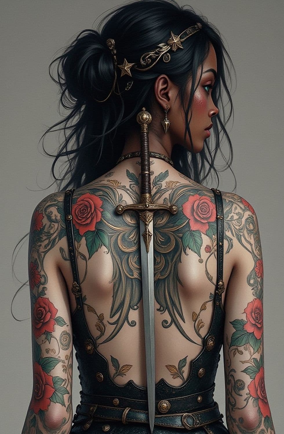 The image features a woman with intricate tattoos covering her back and arms. The tattoos include detailed roses and swirling patterns. Her hair is styled up and adorned with a decorative headband featuring star motifs. A sword is depicted as though it is embedded in the center of her back, aligning with the artistic design of the tattoos. Her attire adds to the mystical and warrior-like essence of the scene.
