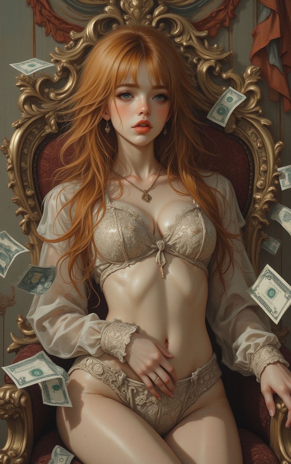 The image depicts a red-haired woman sitting on an ornate throne. She is wearing elegant lingerie with sheer sleeves and is surrounded by floating dollar bills. The background is richly decorated, enhancing the luxurious and opulent atmosphere.