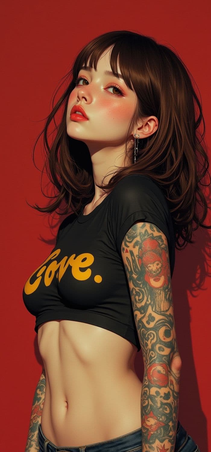 A woman with brunette hair stands against a rich red background. She wears a black crop top with the word 'Love.' in bold yellow letters. Her arms are adorned with intricate tattoos featuring colorful designs. Her expression is confident, with a slight upward gaze. The lighting highlights the natural tones of her skin, adding a touch of realism to her features.