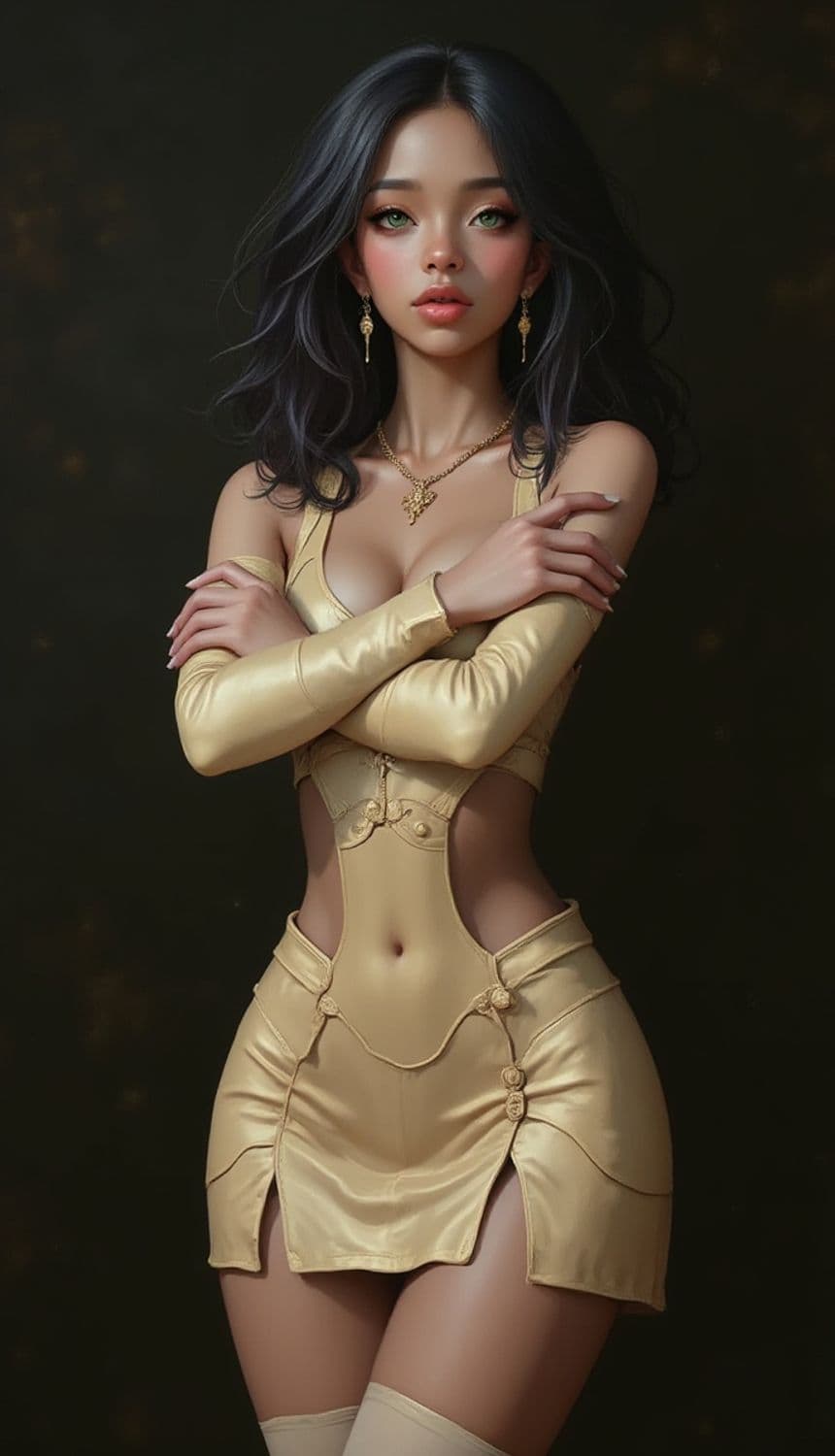 A digital artwork featuring a woman with long dark hair and striking green eyes, wearing a sleek, form-fitting gold outfit with intricate designs. She poses gracefully with her arms crossed, accessorized with elegant gold jewelry, set against a textured dark background.