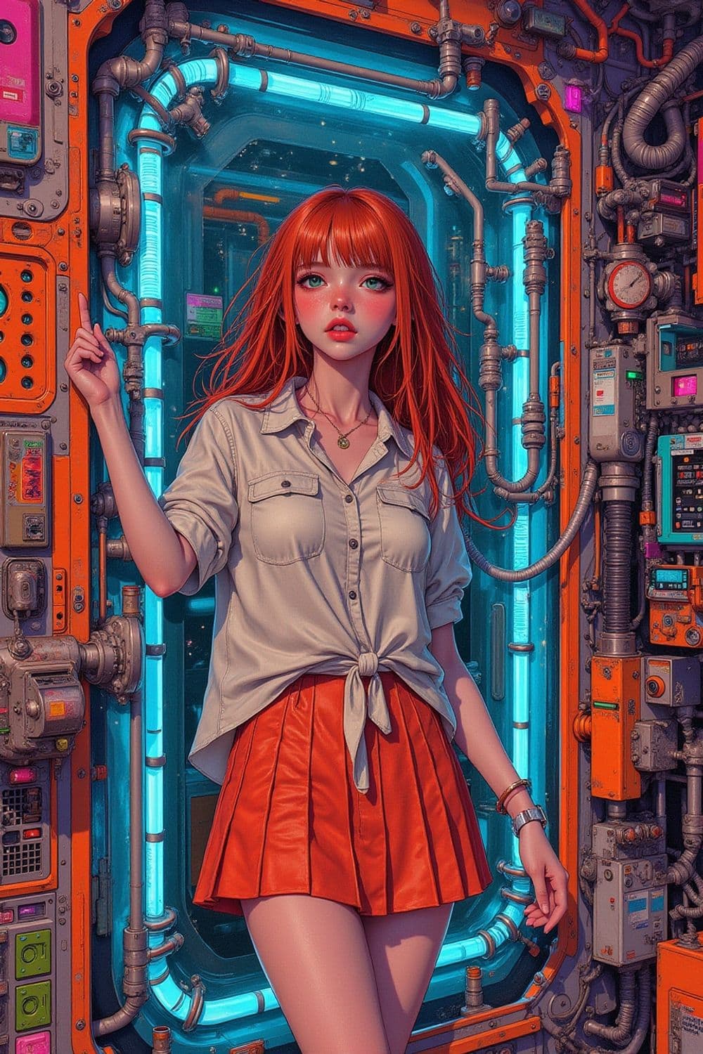 A vibrant, futuristic scene featuring a young woman with striking red hair, dressed in a casual white blouse tied at the waist and a bright orange skirt. She stands confidently next to an intricate control panel filled with glowing blue and orange lights and various mechanical components.
