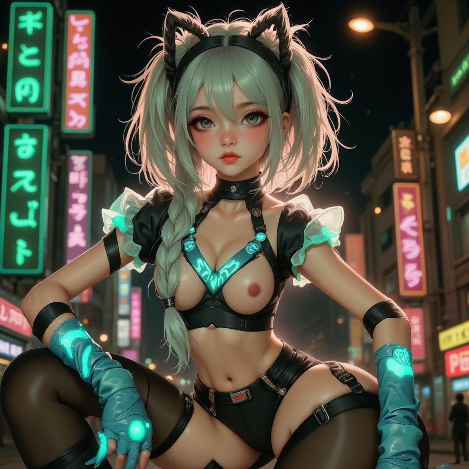 The image features an anime-style character with long, silver hair tied in pigtails, adorned with animal ear accessories. She's dressed in a futuristic, luminescent outfit with glowing accents, set against a vibrant cityscape illuminated by neon signs in Japanese. Her expression is captivating and mysterious, fitting the cyberpunk aesthetic.