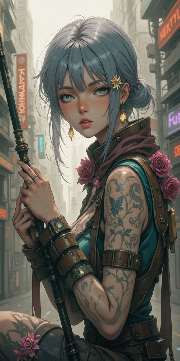 A woman with striking teal hair and captivating green eyes stands in an urban setting, possibly a futuristic city. Adorned with intricate tattoos of butterflies and vines, she wears a sleeveless outfit with leather straps and metal buckles. Her attire is accented by pink roses and a golden star-shaped hairpin. She holds a long staff with a focused expression.