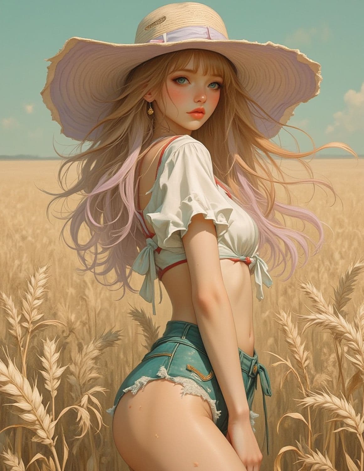 The image depicts a digitally illustrated young woman standing in a wheat field. She has long, wavy lavender hair and wears a large brimmed sun hat. Her outfit consists of a white, tied crop top and high-waisted denim shorts. The warm tones of the field contrast with the cool color of the sky, creating a serene and harmonious scene.