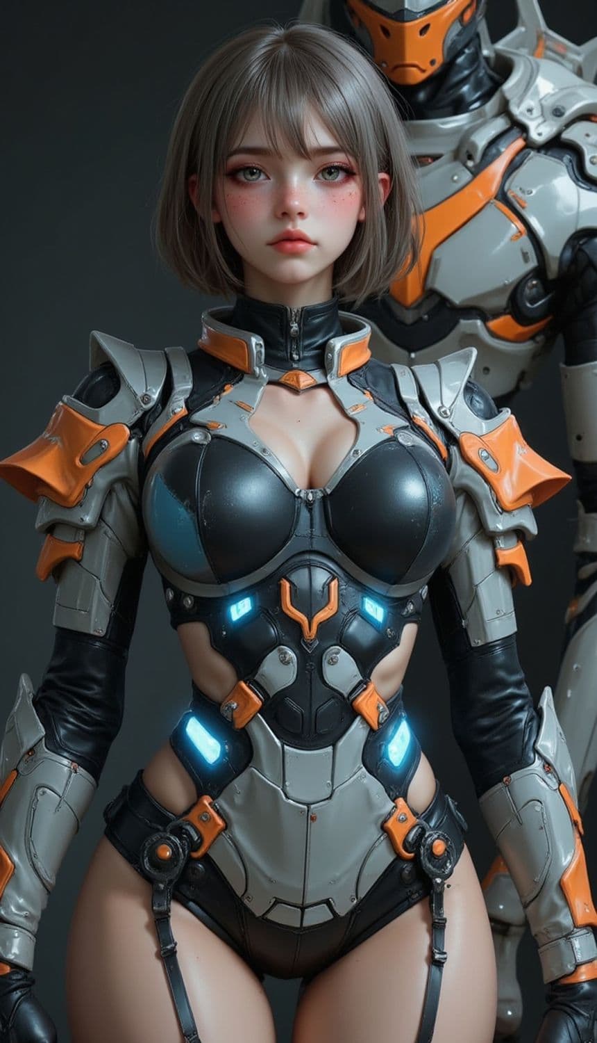 A futuristic warrior stands confidently in a high-tech armor suit featuring a sleek design with orange and grey panels. The suit is detailed with glowing blue accents, adding a sophisticated technological vibe. The warrior's short, stylish hair and serene expression convey strength and determination, while the suit's intricate design highlights agility and protection.