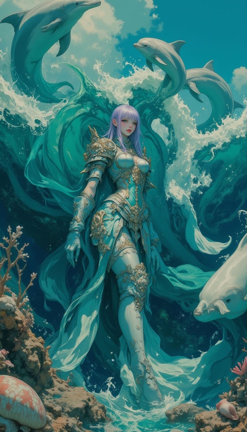 A mystical aquatic scene featuring a female warrior with long, lavender hair dressed in ornate, sea-themed armor. She stands amidst swirling ocean waves, surrounded by dolphins in mid-leap. The vibrant turquoise water creates a dramatic backdrop, while coral and ocean flora decorate the foreground, enhancing the marine fantasy theme.