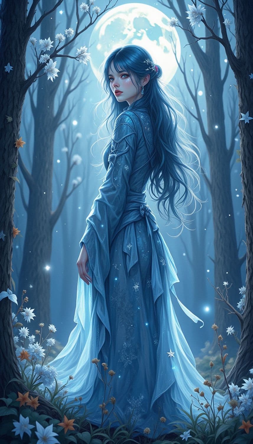 In a mystical forest clearing bathed in the soft glow of moonlight, a captivating female character stands with an aura of mystery and elegance. Her attire is a flowing gown made of shimmering, translucent fabric that mirrors the silvery hues of the moon. Her hair, a striking shade of midnight blue, cascades down her back in soft waves, framing a face with delicate, ethereal features. Her eyes, a brilliant shade of silver, seem to reflect the light of the stars above. She wears a delicate circlet of moonstone and silver, enhancing her regal and mystical presence. The background is a breathtaking scene of ancient trees with leaves that glisten like silver in the moonlight, and gentle wisps of mist that dance around her feet. The style is a blend of fantasy and realism, with a focus on cool color tones and intricate detailing, creating a serene and enchanting atmosphere.