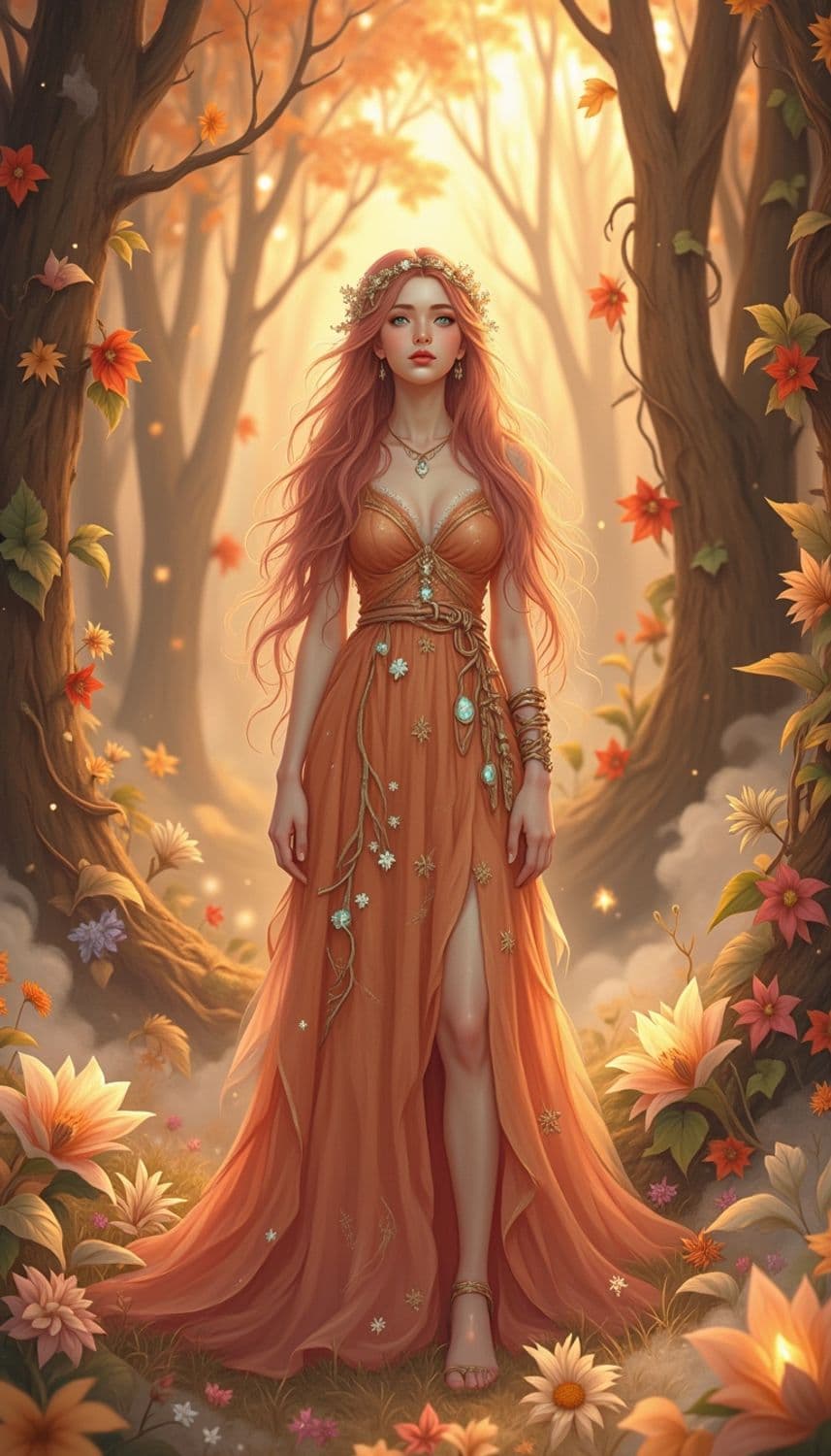 In a mystical, ethereal realm of floating, luminescent vines under a sky painted with the colors of dawn, a captivating female figure stands amidst the radiant flora. Her attire is a flowing gown crafted from a fabric that seems to capture the essence of dawn's first light, blending shades of soft coral and shimmering gold. Her hair, a striking shade of dawn rose, cascades down her back in intricate, cascading waves, framing a face with delicate, serene features. Her eyes, a mesmerizing shade of morning dew green, seem to reflect the mysteries of the awakening world. She wears a delicate crown made of intertwining vine tendrils and tiny, luminescent opals, enhancing her celestial and otherworldly presence. The background is a breathtaking scene of luminescent vines and gentle, glowing streams that weave through the realm, creating a serene and enchanting atmosphere. The style is a blend of fantasy and dawn elegance, with a focus on warm color tones and intricate detailing, creating a mesmerizing and otherworldly atmosphere.