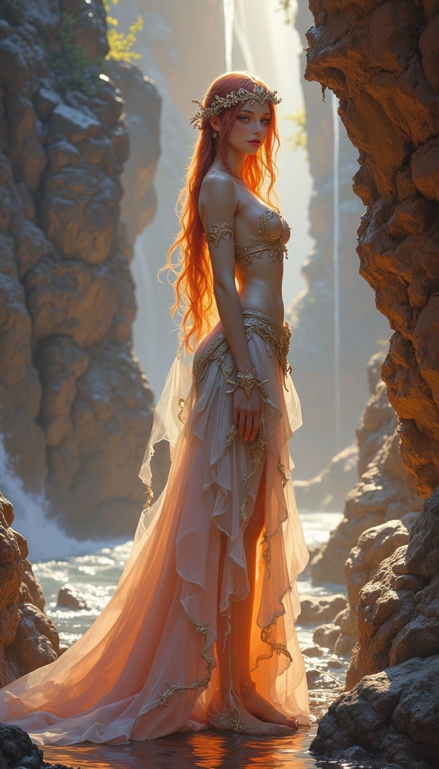 In a mystical, ethereal canyon at dawn, a captivating female figure stands amidst towering rock formations and gentle, glowing streams. Her attire is a flowing, ethereal gown crafted from a shimmering, translucent fabric that captures the colors of a sunrise, blending shades of soft coral and pale gold. Her hair, a striking shade of dawn auburn, cascades down her back in intricate, cascading waves, framing a face with delicate, serene features. Her eyes, a captivating shade of sunrise amber, seem to reflect the mysteries of the canyon. She wears a delicate circlet made of entwined canyon vines and tiny, luminescent gemstones, enhancing her ethereal and otherworldly presence. The background is a breathtaking scene of rugged cliffs and gentle, glowing pools that catch the first light of the day, creating a serene and enchanting atmosphere. The style is a blend of fantasy and natural elegance, with a focus on warm color tones and intricate detailing, creating a mesmerizing and otherworldly atmosphere.
