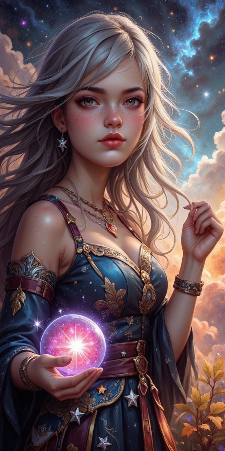 A mystical young woman with long silver hair gazes intently, holding a radiant orb. She's adorned in a richly detailed gown with celestial motifs and intricate jewelry. The background is a cosmic scene with glowing clouds and stars, enhancing the magical ambiance.