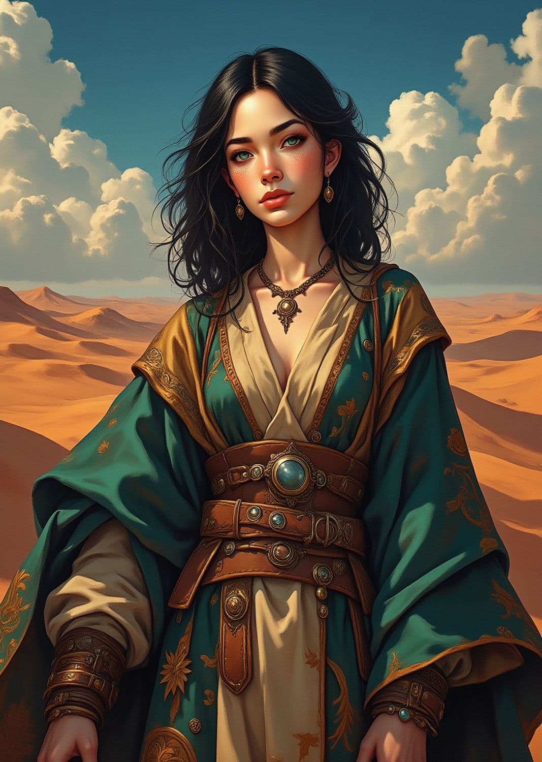 A captivating figure stands in the midst of a desert landscape. She has long, flowing dark hair and wears ornate jewelry, including a necklace with a central pendant and matching earrings. Her attire consists of richly decorated garments in shades of teal and earth tones, featuring intricate embroidery and layered belts with gemstone accents. The background reveals sweeping sand dunes under a sky adorned with fluffy clouds.
