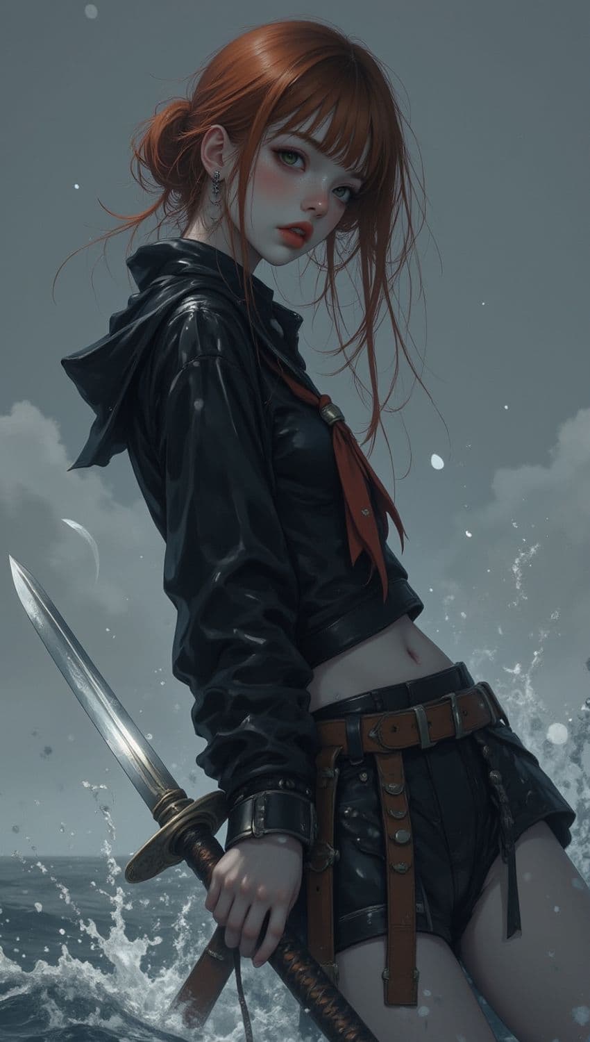 A striking female warrior stands against a backdrop of tumultuous seas. Her vibrant red hair is elegantly styled, complementing her commanding presence. She wears a black, weathered outfit with a red tie, embodying a mysterious allure. A finely crafted sword is clutched in her hand, ready for battle.