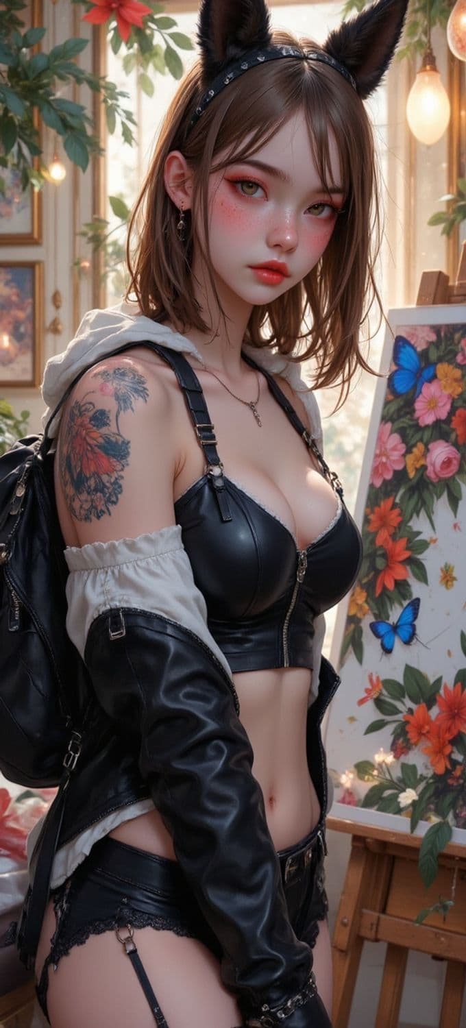 A young woman with cat ears stands confidently in a room filled with natural light and vibrant decor. She has short brown hair and striking makeup with a focus on her eyes and lips. Her attire is edgy, featuring a black leather ensemble that accentuates her bold look. The presence of a detailed tattoo on her arm adds an artistic touch to her style. In the background, an easel with colorful butterflies and flowers suggests a creative environment.
