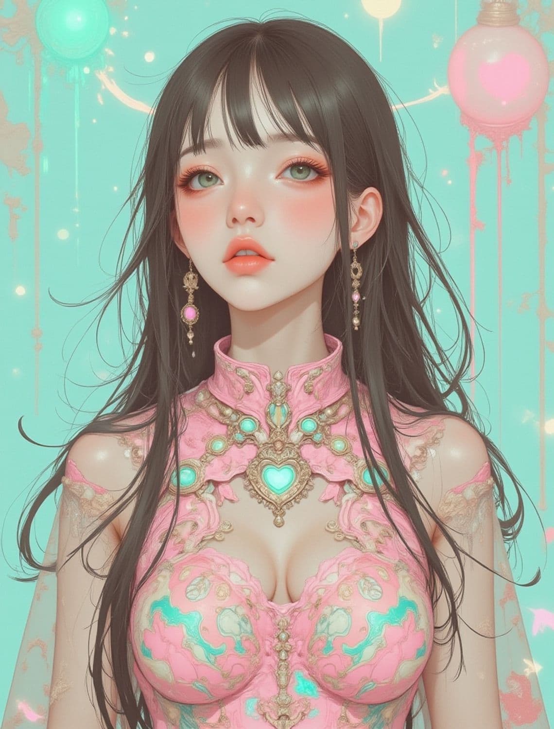 A portrait of a young woman with long dark hair, adorned with intricate pink and turquoise jewelry. Her dress features an elaborate design with heart motifs and ornamental details, set against a pastel background with glowing orbs.