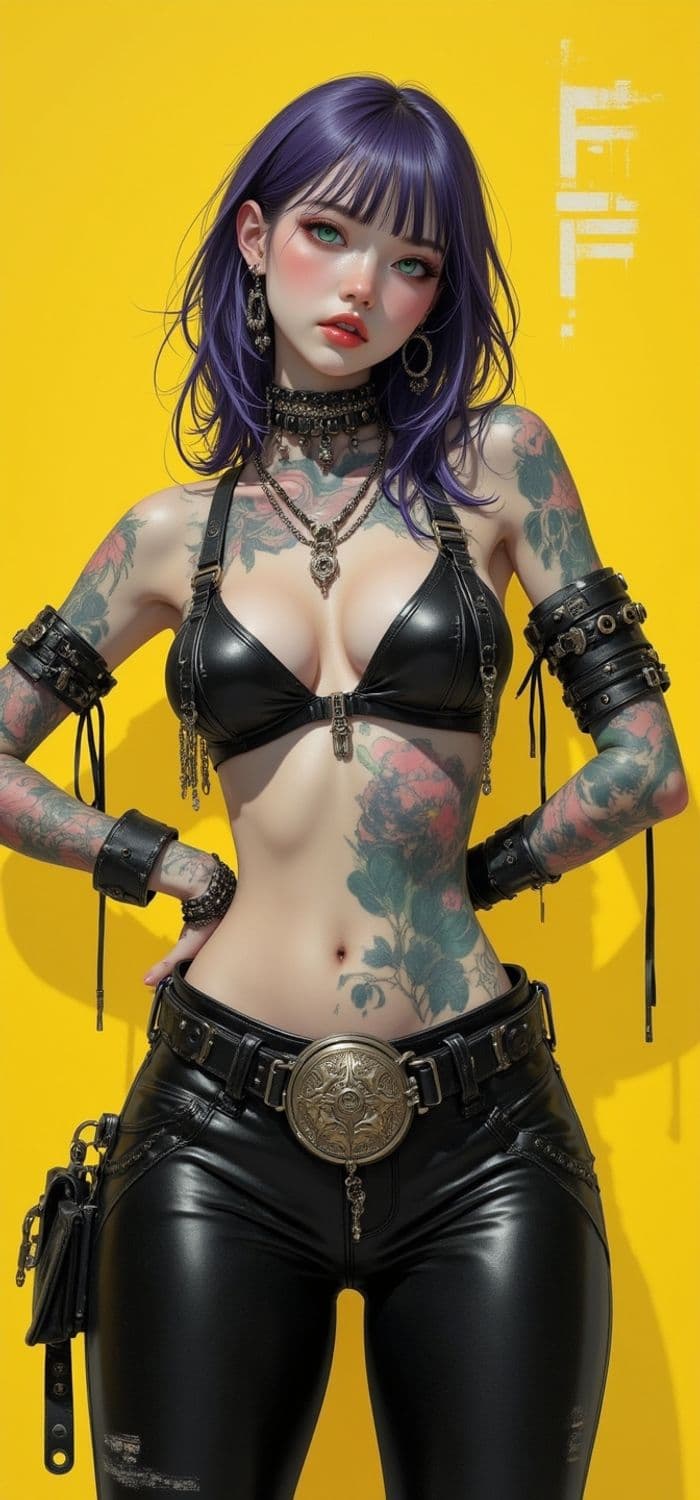 A striking character with purple hair stands confidently against a vibrant yellow background. She is adorned in a black leather top and pants, showcasing intricate tattoos on her arms. Accessories include multiple earrings, necklaces, and leather bands, exuding a bold and edgy aura.