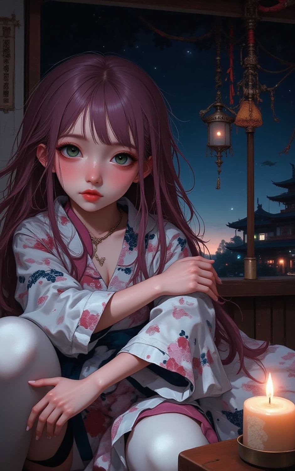 A beautifully illustrated character sits in a dimly lit room, dressed in a floral-patterned robe. She has long, flowing purple hair and captivating green eyes, exuding a sense of serene contemplation. A softly glowing candle and traditional lanterns cast a warm light, contrasting with the cool, starlit night visible through the window.