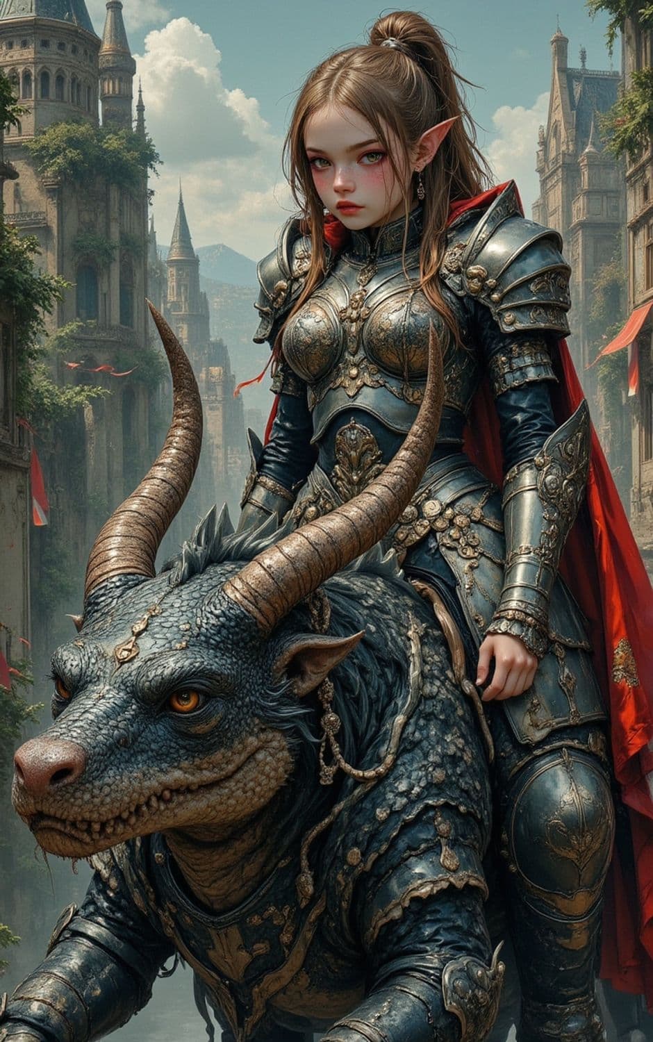 A fantasy warrior in elaborate armor sits atop a mythical creature resembling a dragon with prominent horns. The warrior has pointed elf-like ears, long hair, and a red cloak, set against a backdrop of a medieval city with tall towers and intricate stonework.