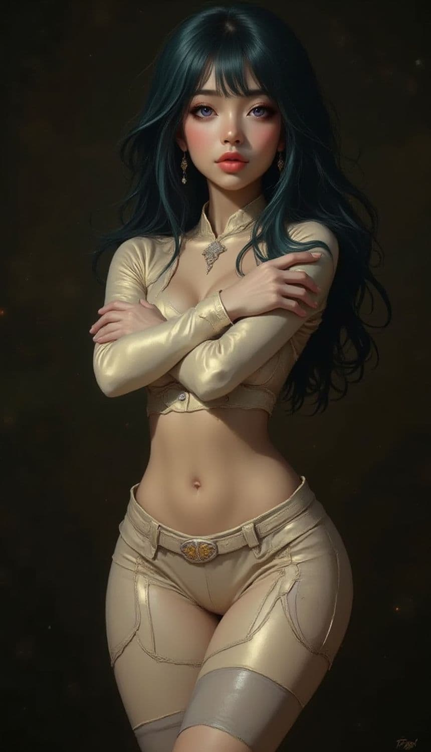 A digital painting of a striking woman with long teal hair and captivating eyes. She wears form-fitting, shimmering gold clothing that accentuates her figure. Her pose is confident, embodying a mystical aura. The background is a dark, subtle blend that highlights her luminous presence.