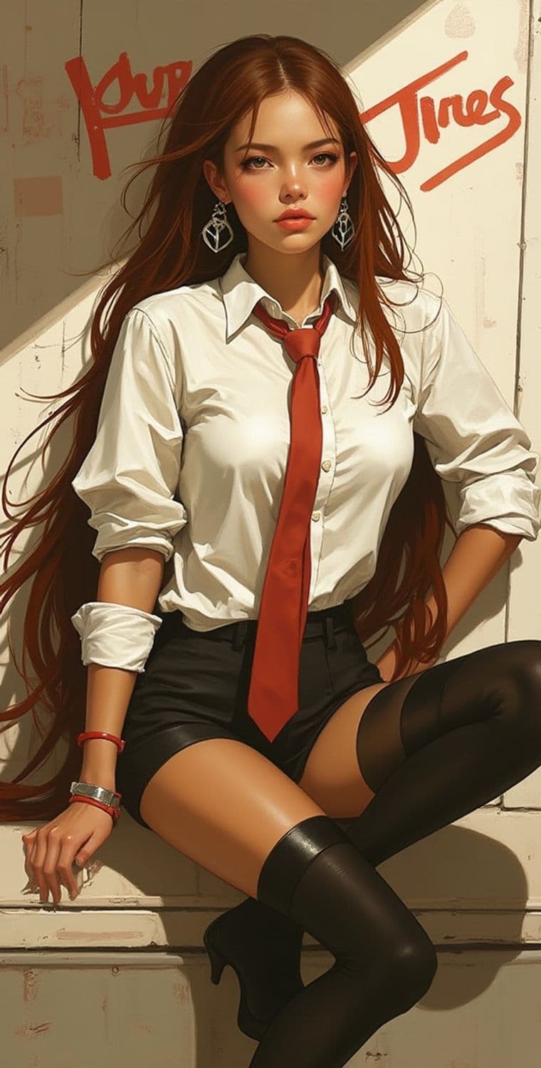 A young woman with long brown hair wearing a white button-up shirt with a red tie and black shorts. She is sitting against a wall with a relaxed posture, her legs crossed and adorned with over-the-knee black stockings. The word 'Jires' is graffitied in red on the wall behind her, adding an urban touch to the scene. Large geometric earrings and multiple bracelets complete her stylish look.