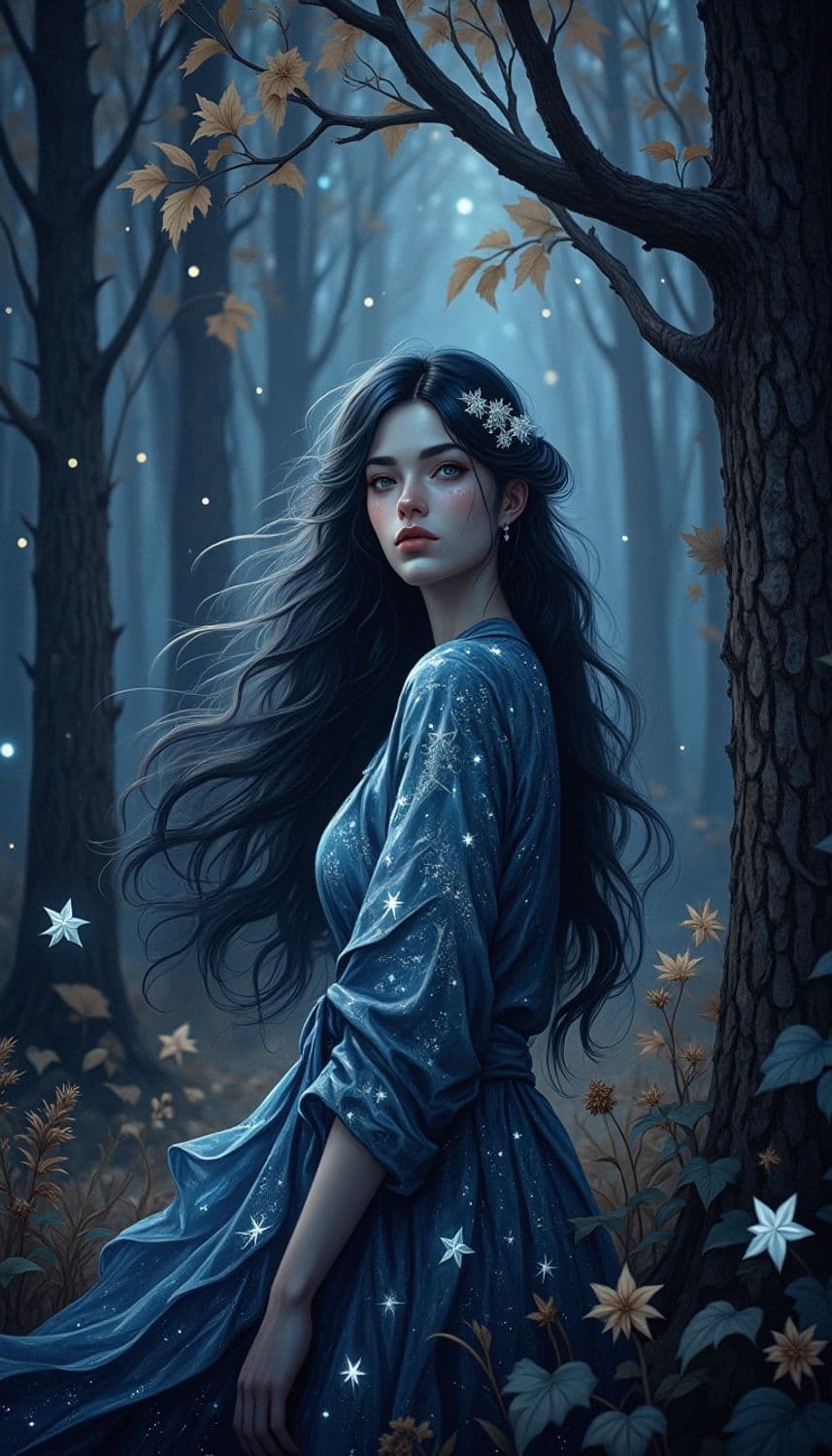 In a mystical, enchanted forest at midnight, a captivating female figure stands amidst towering, ancient trees whose leaves glisten like silver under the moonlight. Her attire is a flowing gown crafted from a fabric that seems to capture the essence of the night sky, blending shades of deep midnight blue and shimmering silver. Her hair, a striking shade of raven black, cascades down her back in intricate, celestial waves, framing a face with delicate, ethereal features. Her eyes, a mesmerizing shade of starlit silver, seem to reflect the mysteries of the cosmos. She wears a delicate circlet made of twinkling stardust and tiny, luminous pearls, enhancing her celestial and enchanting presence. The background is a breathtaking scene of luminous fireflies and gentle, glowing mist that dances around her, creating a serene and enchanting atmosphere. The style is a blend of fantasy and celestial elegance, with a focus on cool color tones and intricate detailing, creating a mesmerizing and otherworldly atmosphere.