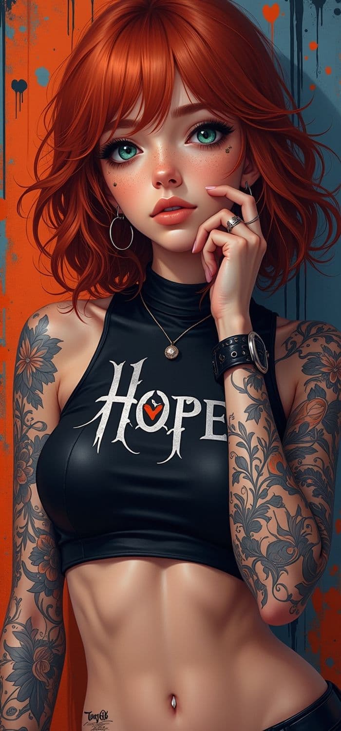 A striking portrait of a young woman with vibrant red hair and captivating green eyes. She wears a sleeveless black top with 'Hope' emblazoned on it, showcasing intricate tattoos on her arms. Her expression is contemplative, with her hand resting on her chin adorned with rings and a studded bracelet. The background is an artistic blend of orange and black, enhancing her fiery appearance.