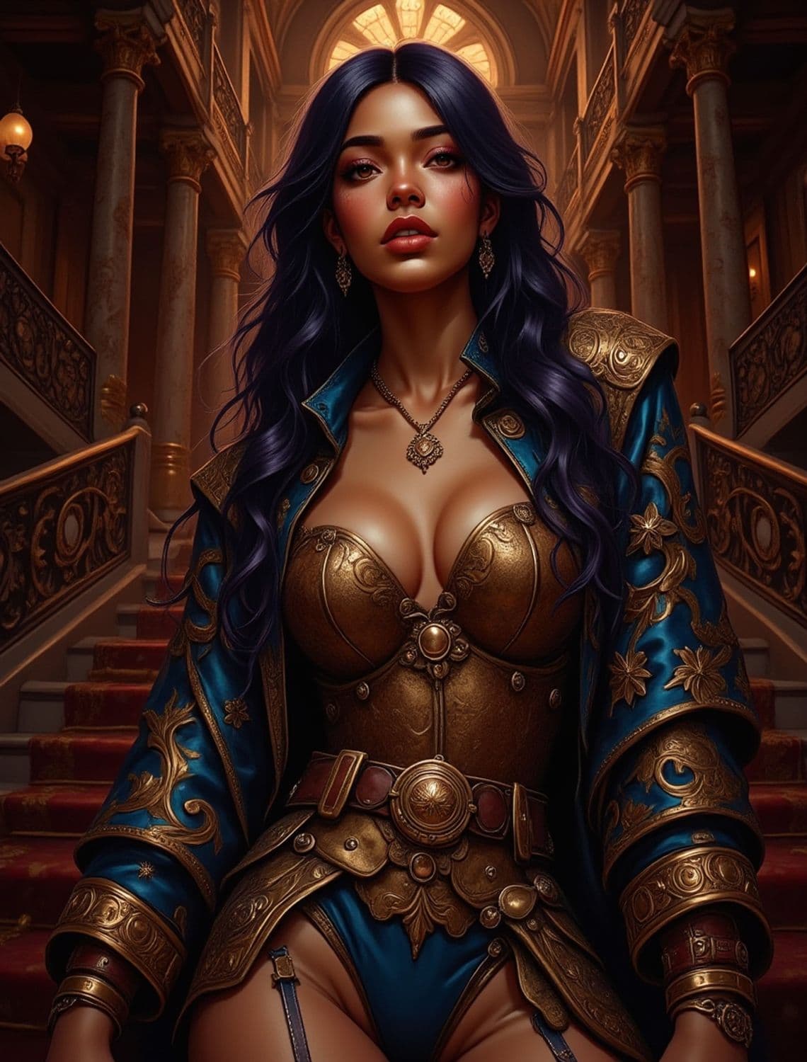 The image showcases a regal woman standing in a grand, ornately decorated hall. She has long, flowing dark hair and wears a luxurious blue and gold outfit with intricate patterns and jewelry, exuding an aura of power and elegance. Behind her is a staircase leading to the upper floors of the palatial estate, with warm lighting casting a golden glow throughout the scene.