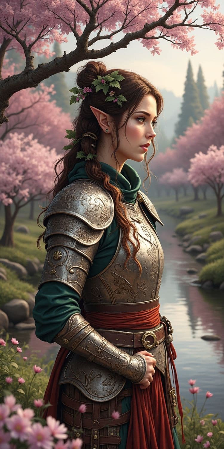 The image depicts an elf-like female figure standing in an enchanting, natural setting with a dreamy and mystical atmosphere. The figure is adorned in intricately detailed armor with floral and vine engravings, colored in antique gold. She wears a deep green gown underneath the armor, accented by a crimson sash around her waist. Her hair is styled with gentle waves, decorated with green leaves and small flowers, complementing her pointed ears. The background features a serene, meandering river lined with lush, pink cherry blossom trees. The scene is bathed in soft, natural lighting, creating a tranquil and ethereal ambiance. The style is a blend of fantasy and realism, emphasizing detailed textures and a harmonious color palette that enhances the mystical, fairytale setting.