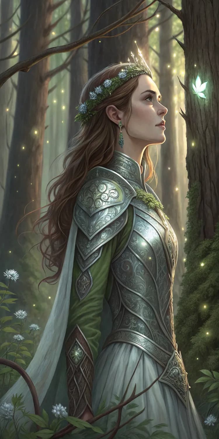 A mystical woman stands in an enchanted forest, surrounded by towering ancient trees with glowing runes etched into their bark. She is dressed in a flowing gown made of shimmering silver and emerald fabrics that seem to blend with the forest. Her armor is light and ethereal, with leaf-like patterns and delicate vines wrapping around her arms. She wears a tiara of silver branches adorned with small, luminescent flowers. Her hair is a deep chestnut brown, cascading in loose waves. The art style combines realism with a touch of fantasy, focusing on the intricate details of her attire and the magical ambiance of the forest. The color palette features lush greens, soft silvers, and warm earth tones, creating a serene and mystical atmosphere.