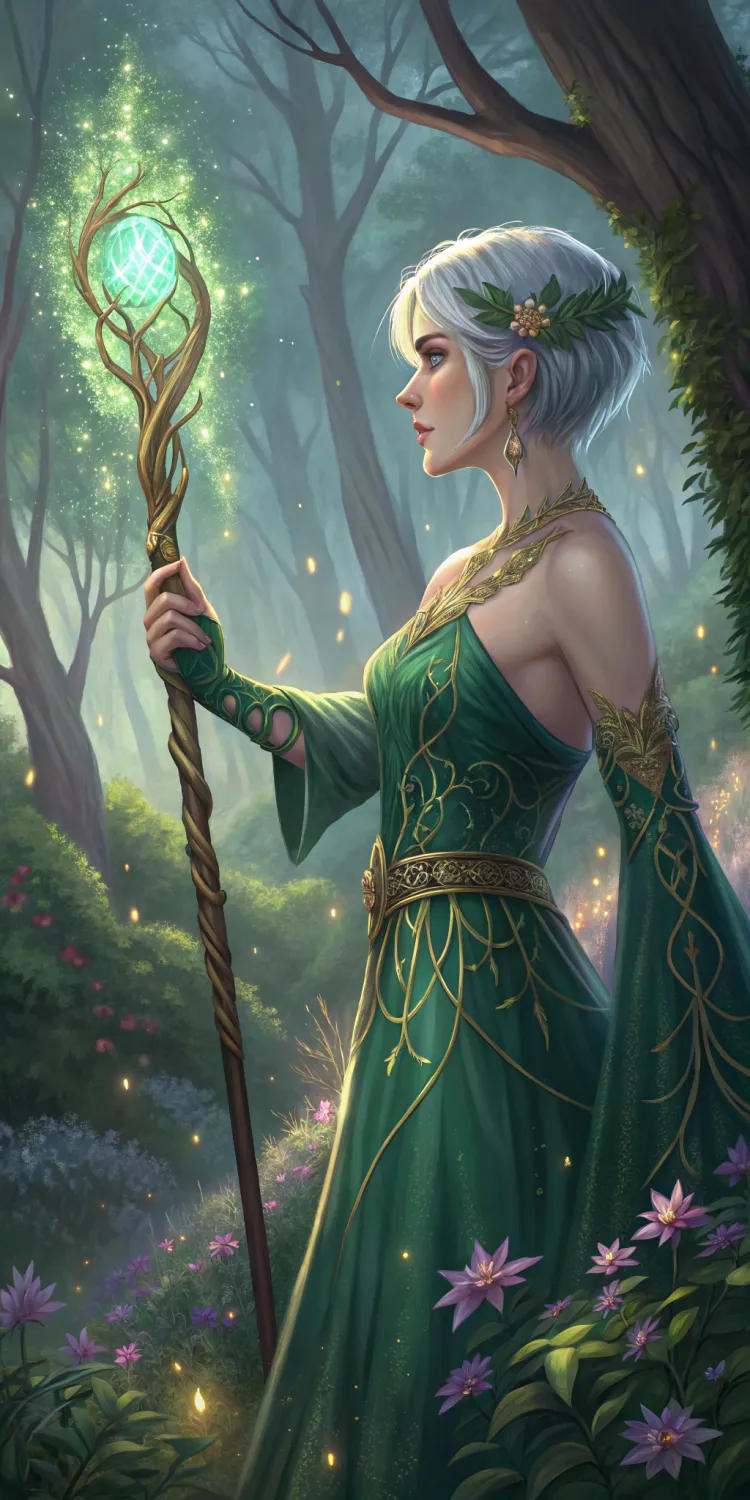 A stylized illustration of a female character in a mystical forest setting. The character has short, silver hair and is dressed in an emerald green gown with gold embroidery. She holds a staff with a glowing crystal orb in her left hand. Her right hand is extended, casting a spell with shimmering sparkles. Her skin has an ethereal glow, reflecting shades of green and gold. A delicate vine tattoo winds around her arm. The background is filled with luminescent plants and a softly glowing moon, creating an enchanting atmosphere. The style is vibrant and digital, with an emphasis on magical lighting and high contrast colors, typical of fantasy art.
