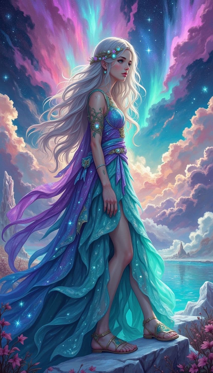 In a mystical, ethereal realm of floating islands suspended in a sky painted with vibrant auroras, a captivating female figure stands on a crystalline bridge. Her attire is a flowing gown crafted from a fabric that seems to capture the essence of a rainbow, blending shades of vivid magenta and shimmering turquoise. Her hair, a striking shade of celestial silver, cascades down her back in intricate, twinkling waves, framing a face with delicate, serene features. Her eyes, a mesmerizing shade of aurora green, seem to reflect the mysteries of the celestial skies. She wears a delicate circlet made of intertwining celestial vines and tiny, luminescent opals, enhancing her mystical and otherworldly presence. The background is a breathtaking scene of luminescent islands and gentle, glowing streams that weave through the realm, creating a serene and enchanting atmosphere. The style is a blend of fantasy and celestial elegance, with a focus on vibrant color tones and intricate detailing, creating a mesmerizing and otherworldly atmosphere.