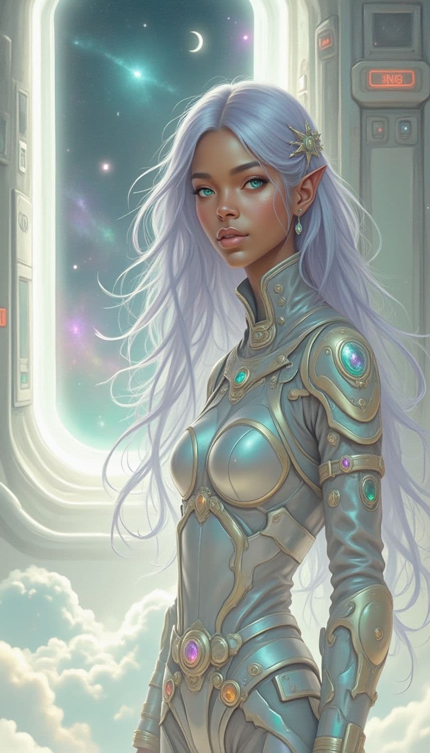 A futuristic character stands in a space-themed setting with a window view of the stars and crescent moon. Her long, silvery hair flows gracefully, accentuated by a star-shaped accessory. She wears a form-fitting, ornate suit with glowing gemstones embedded throughout. The background showcases a celestial view filled with clouds, stars, and cosmic elements.