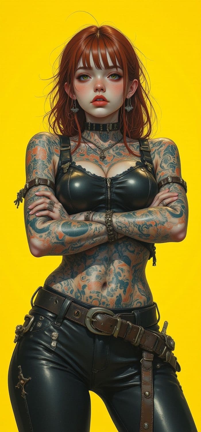 The image features a striking character with vibrant red hair against a bold yellow background. The figure is adorned with intricate tattoos covering her arms and torso. She wears a black leather top and pants, with multiple buckles and straps, exuding a rebellious aura. Her expression is confident and intense, complemented by elegant earrings.