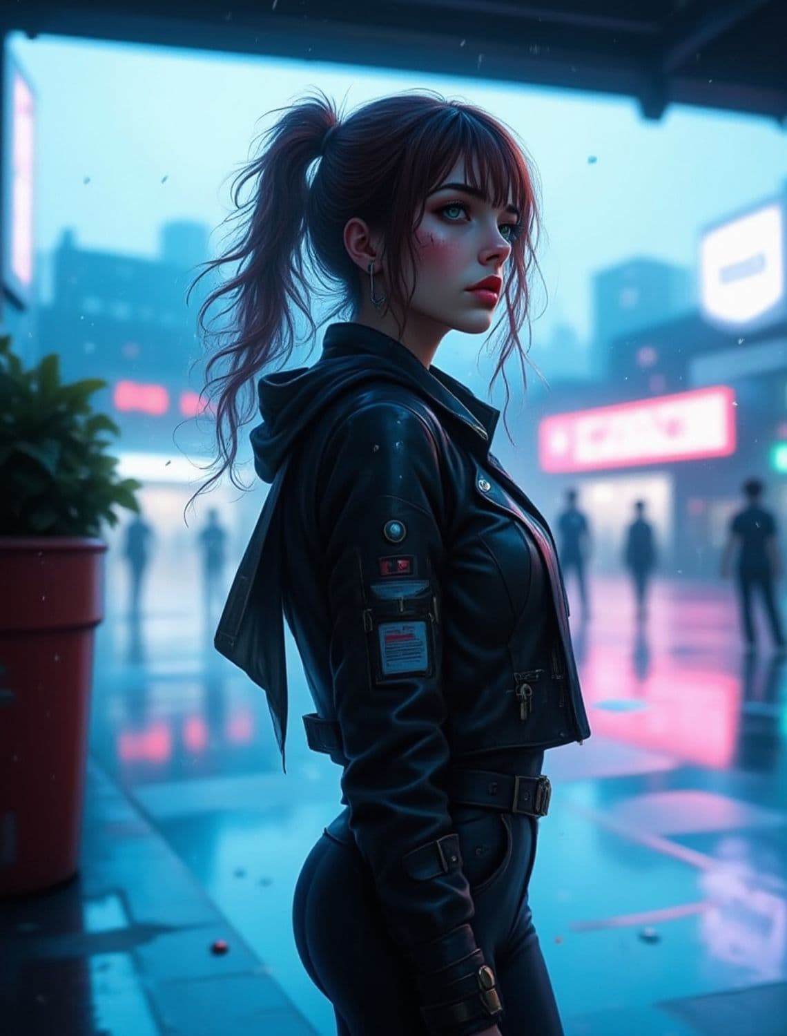 A young woman with a high ponytail stands confidently in a futuristic urban setting. She wears a sleek leather jacket adorned with patches and buckles. The background is blurred, with bright neon lights reflecting on the wet pavement. The atmosphere is moody and mysterious.