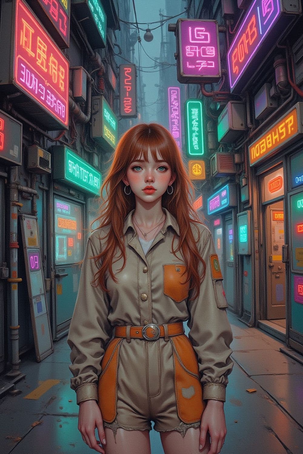 A young woman stands confidently in a narrow, neon-lit alleyway. She has long auburn hair and wears a beige and orange utility jumpsuit, giving her a futuristic yet casual appearance. The alley is lined with vibrant neon signs in various colors, casting an urban, cyberpunk glow over the scene.