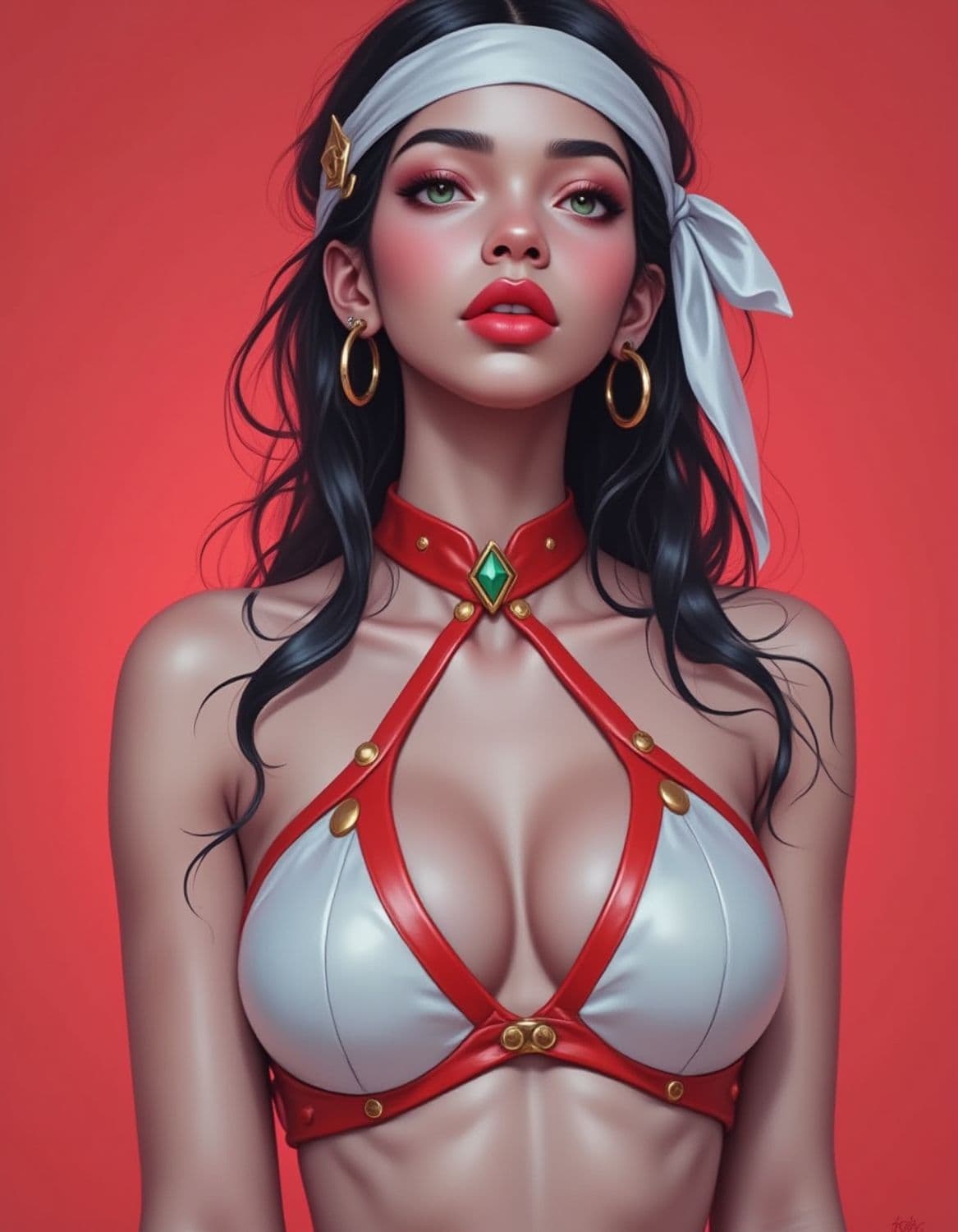 The image depicts a striking woman with long, black hair adorned with a white headband and gold earrings. Her makeup is bold, with red lips and prominent eye makeup. She wears a red strappy top with gold accents and reveals a confident expression against a vibrant red background.