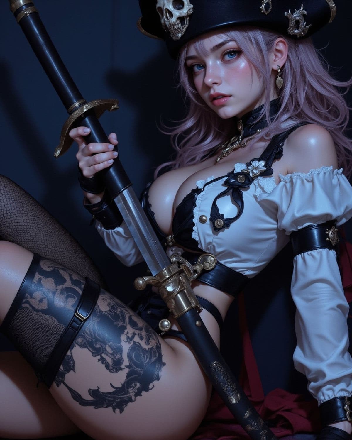 A striking image of a woman with pink hair dressed as a pirate. She wears a black tricorn hat adorned with a skull, lace-trimmed off-shoulder blouse, and corset with intricate black detailing. Her thigh showcases a bold tattoo, and she holds a large sword, exuding an aura of authority and elegance.