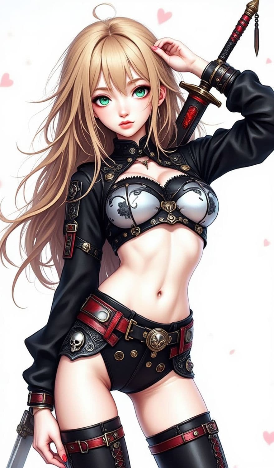 An anime-style character with blonde hair and striking green eyes, wearing a detailed black and red outfit with skull motifs. She has a sword sheathed at her side. The background is white with small heart designs.