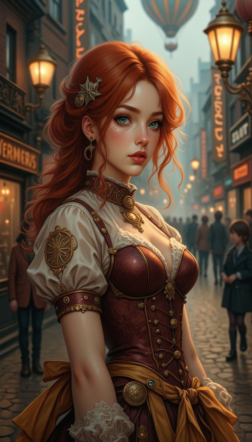 A striking scene featuring a young woman with vibrant red hair, styled in loose waves with a decorative star-shaped hairclip. She wears a steampunk-inspired outfit with ornate detailing, including a corset and lace-trimmed sleeves. Her expression is poised and enigmatic as she stands in a vintage city street with warm street lights and blurred figures in the background, creating a nostalgic and mysterious atmosphere.