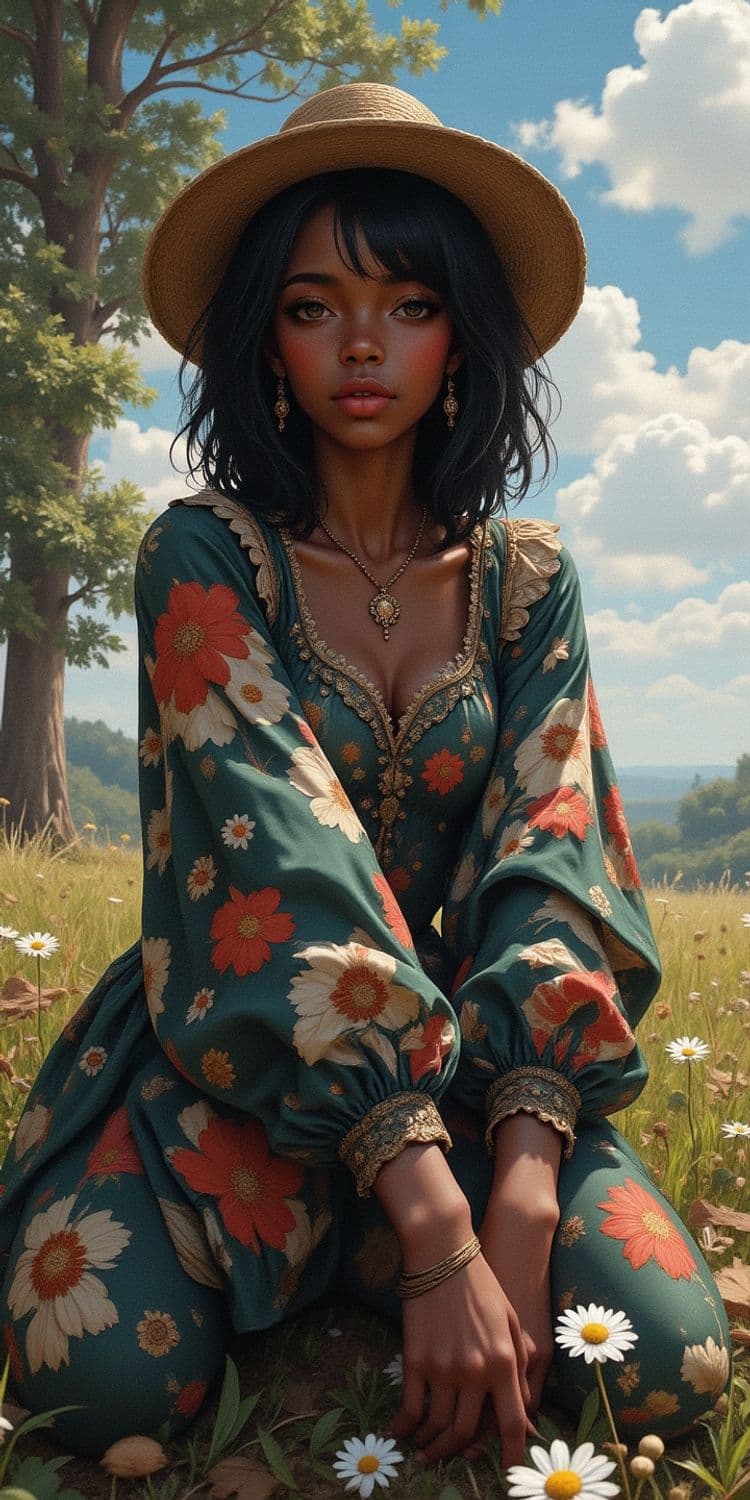 A woman is kneeling in a field of daisies under a bright blue sky with fluffy clouds. She is wearing a wide-brimmed straw hat and a long, flowy dress adorned with large orange and white flowers. Her dark hair frames her face, adorned with earrings and a necklace. The setting is bright and summery, with trees and open fields in the background.