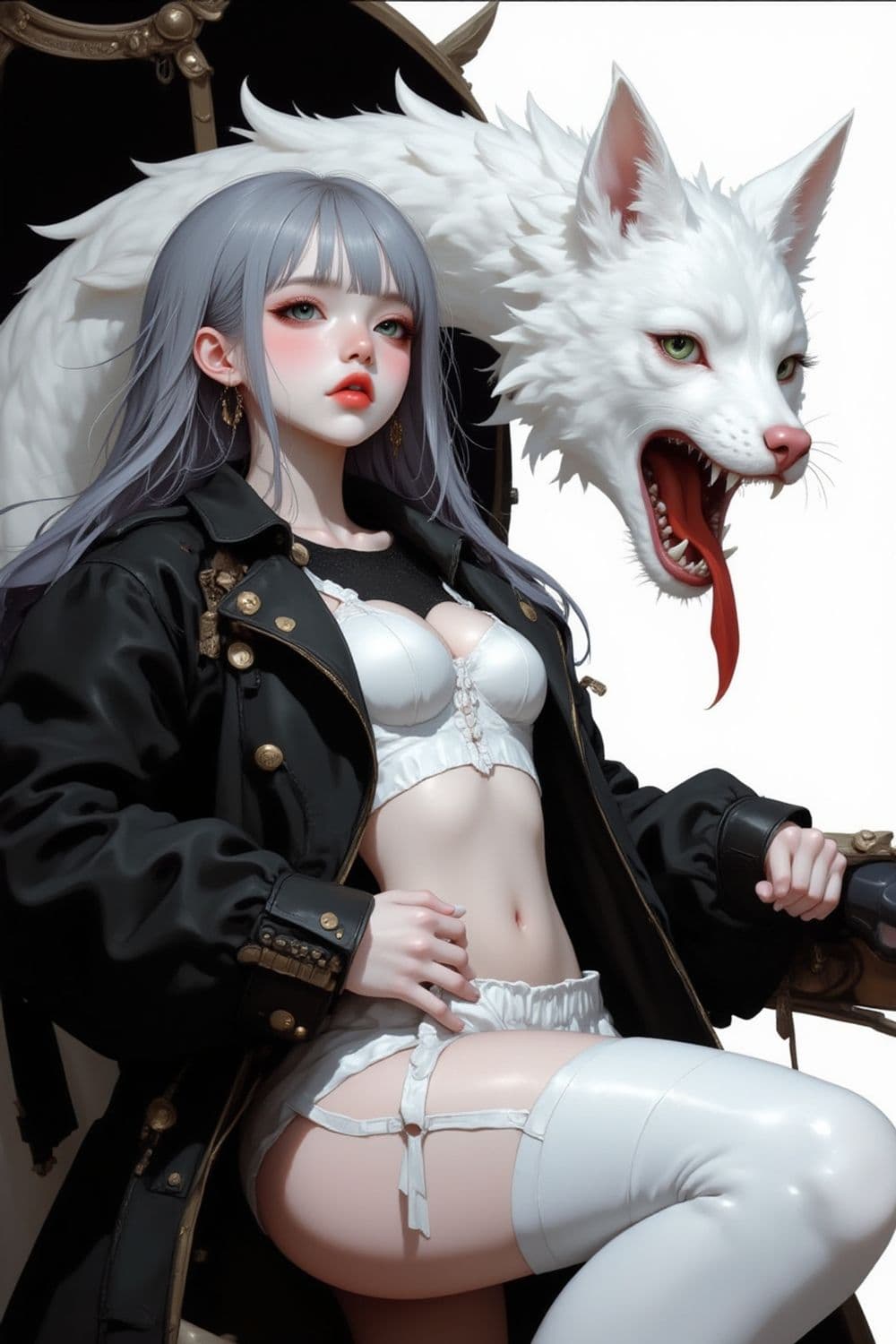 A striking character with long silver hair and intense expression sits confidently. Wearing a white and gold embellished outfit, she exudes an air of mystery and power. A menacing white wolf-like creature with a vivid red tongue looms behind her, complementing her commanding presence. The background is artistically abstract, enhancing the fantastical theme.
