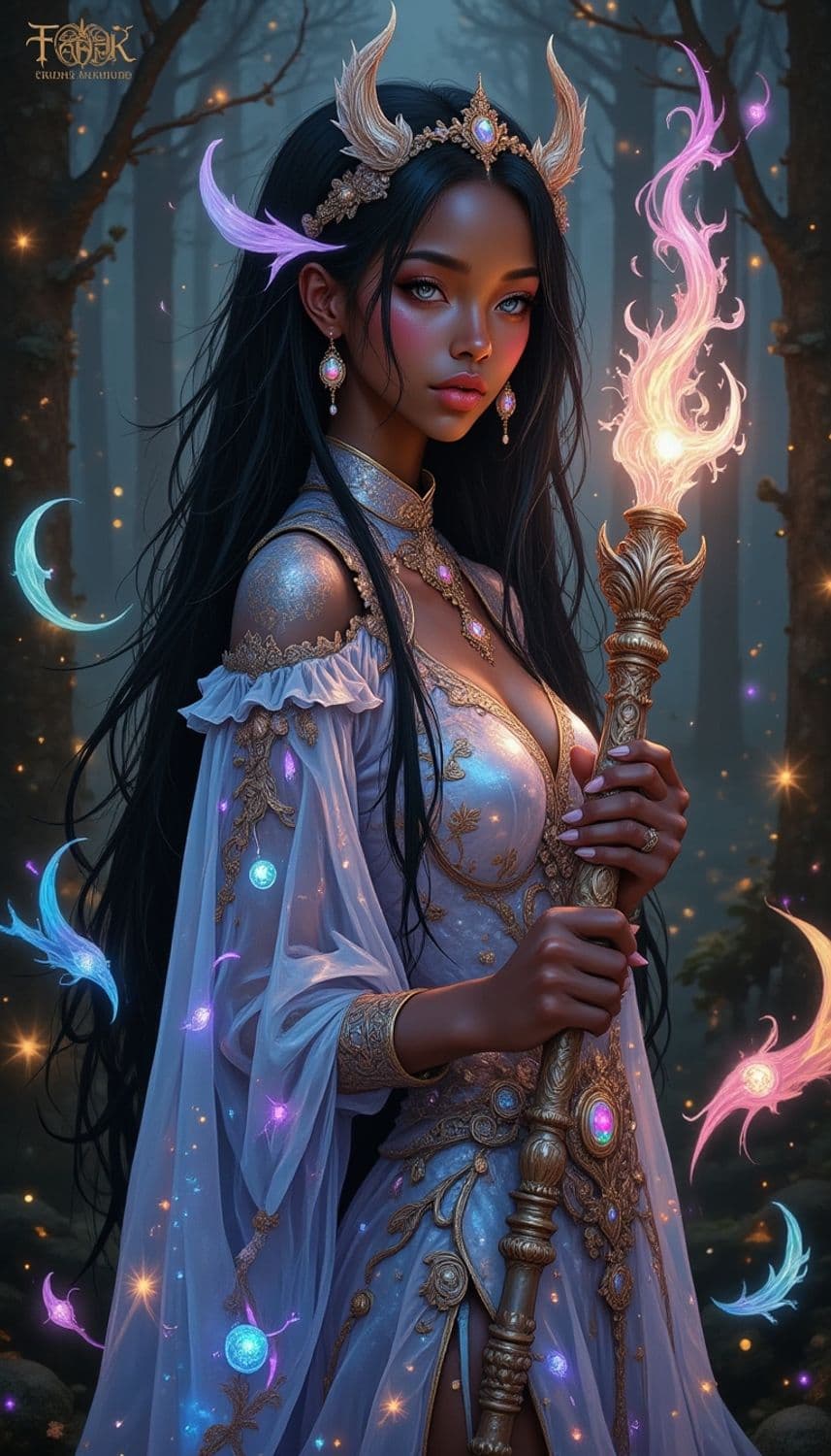 A mystical woman stands in a magical forest, holding an ornate staff with a flame-like aura. She wears a detailed, ornate gown adorned with glowing gems and embroidery. Her headpiece features luminescent horns, and her long hair cascades around her. The atmosphere is enchanted, with floating ethereal lights and small glowing creatures surrounding her.