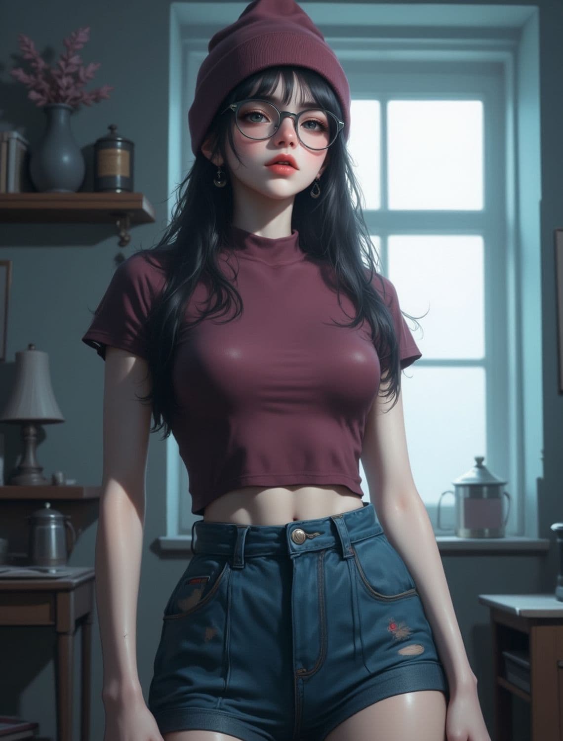 A stylized image of a young woman with long dark hair, wearing a maroon beanie and glasses. She sports a maroon crop top and high-waisted denim shorts. The setting is a room with soft lighting, casting delicate shadows. In the background, a window casts natural light into the space, illuminating a shelf with decor items like a vase and framed pictures.
