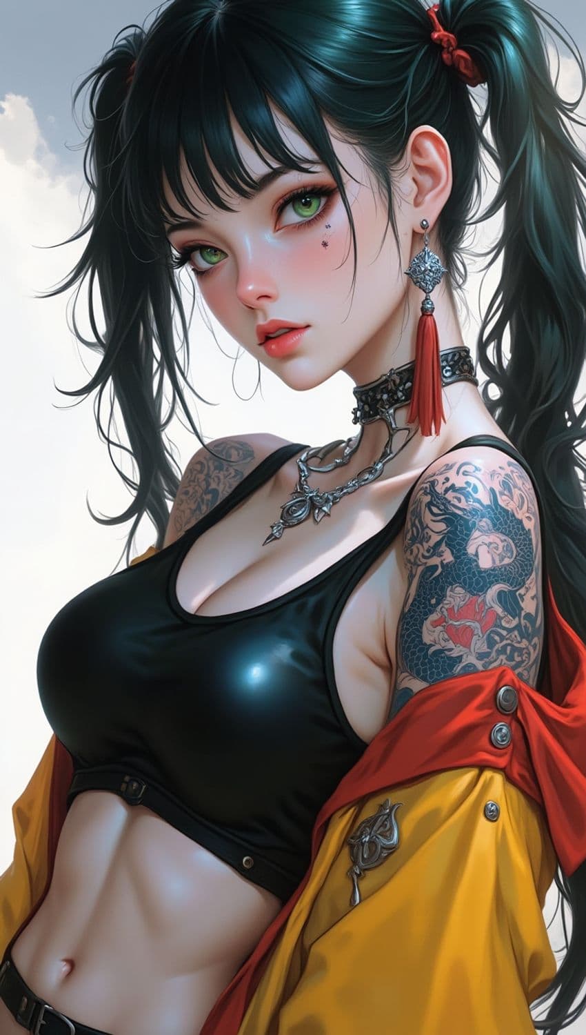 A striking woman with vivid green eyes and long black hair styled in twin ponytails. She wears a distinctive choker and intricate earrings, complementing her look with a sleeveless black top that reveals a detailed tattoo of a dragon on her upper arm. The outfit is completed with a yellow jacket draped over her shoulders. The backdrop is a soft sky, giving the portrait an ethereal vibe.