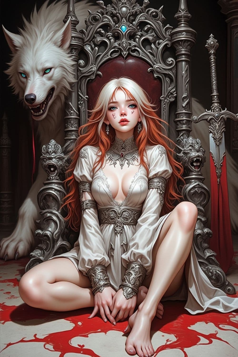 A striking fantasy scene featuring a woman with long red hair and intricate armor-like jewelry seated on an ornate throne. Beside her, a large white wolf with piercing blue eyes stands guard. The setting is dramatic, with a large sword leaning against the throne and a pool of red liquid on the floor, adding a contrast to the white and silver tones of her dress and surroundings.
