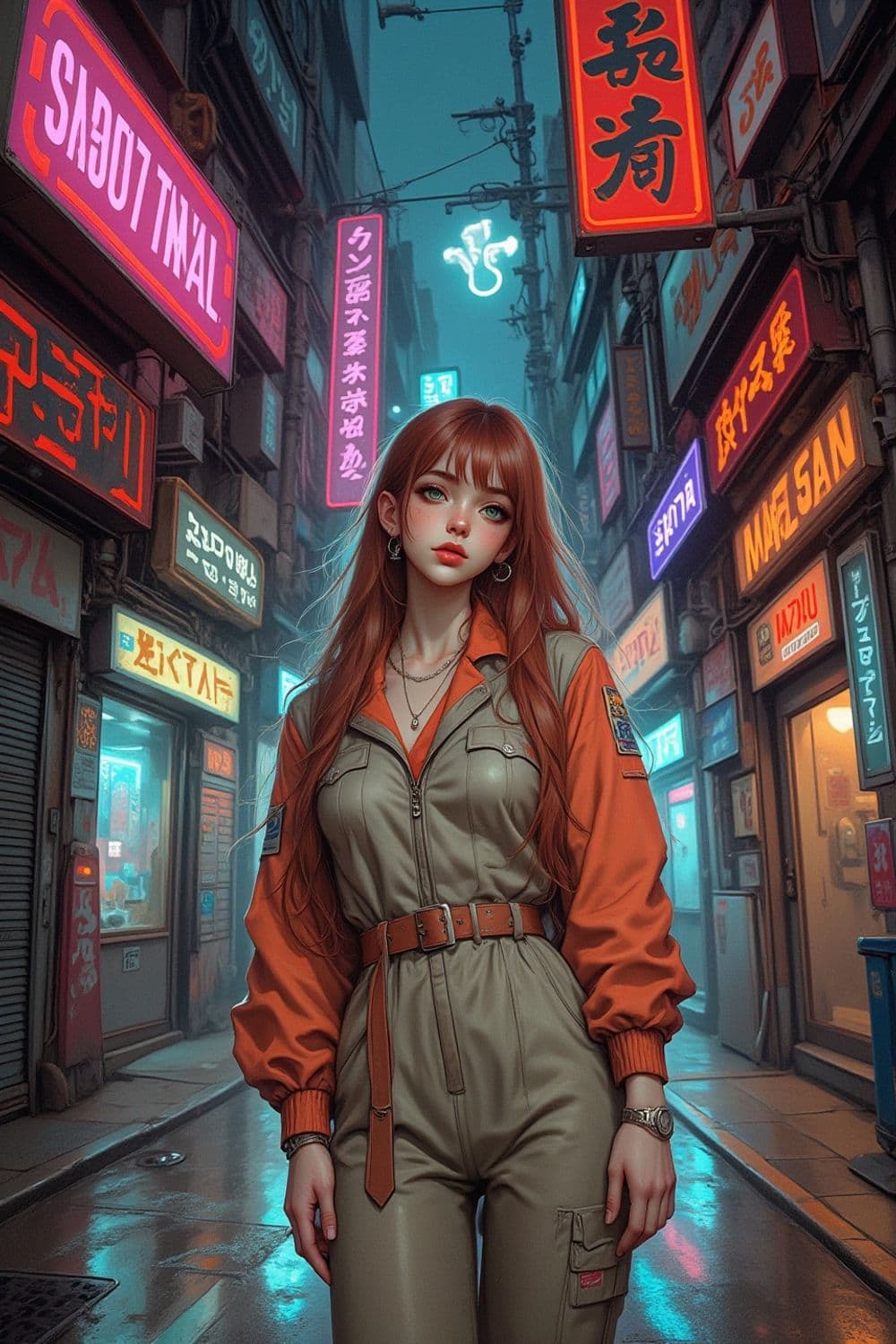 A young woman with long red hair stands confidently in a neon-lit urban alleyway. Wearing a belted jumpsuit with an orange jacket, she exudes a strong yet approachable aura. The surroundings are vibrant, with colorful signs in various languages illuminating the narrow street, creating a modern, bustling city atmosphere.