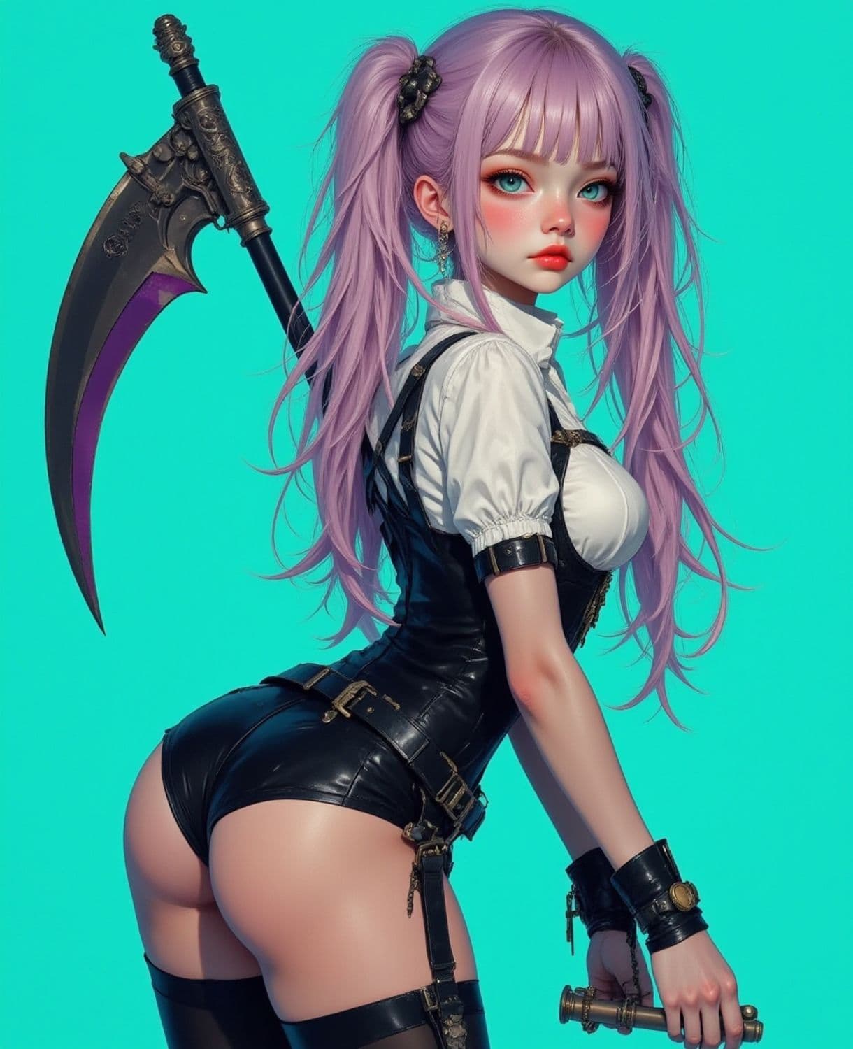 The image features an animated character with long purple hair styled in pigtails, accentuated by bangs. She is wearing a white blouse under a black leather corset and matching shorts. Her pose is dynamic, with an hourglass figure emphasized. She wields a large, ornate scythe over her shoulder, and holds a small object in her other hand. The background is a solid teal color, highlighting her features.